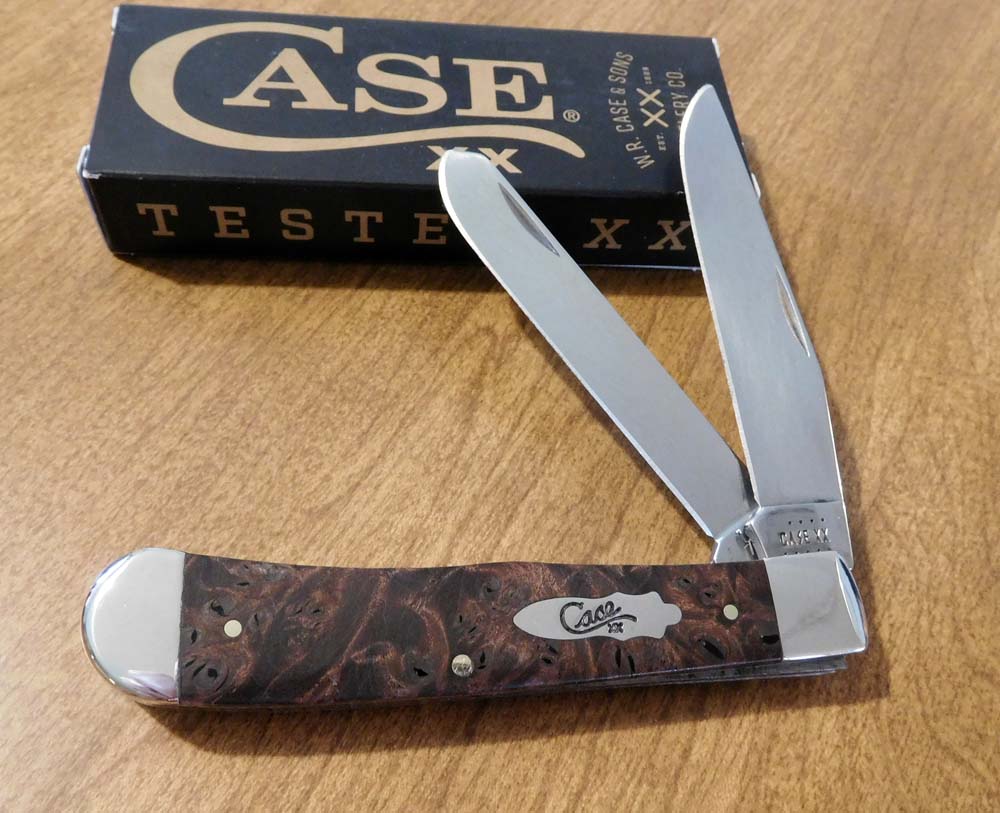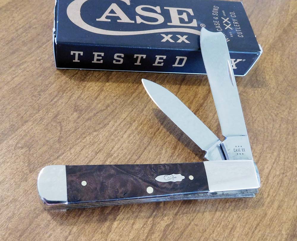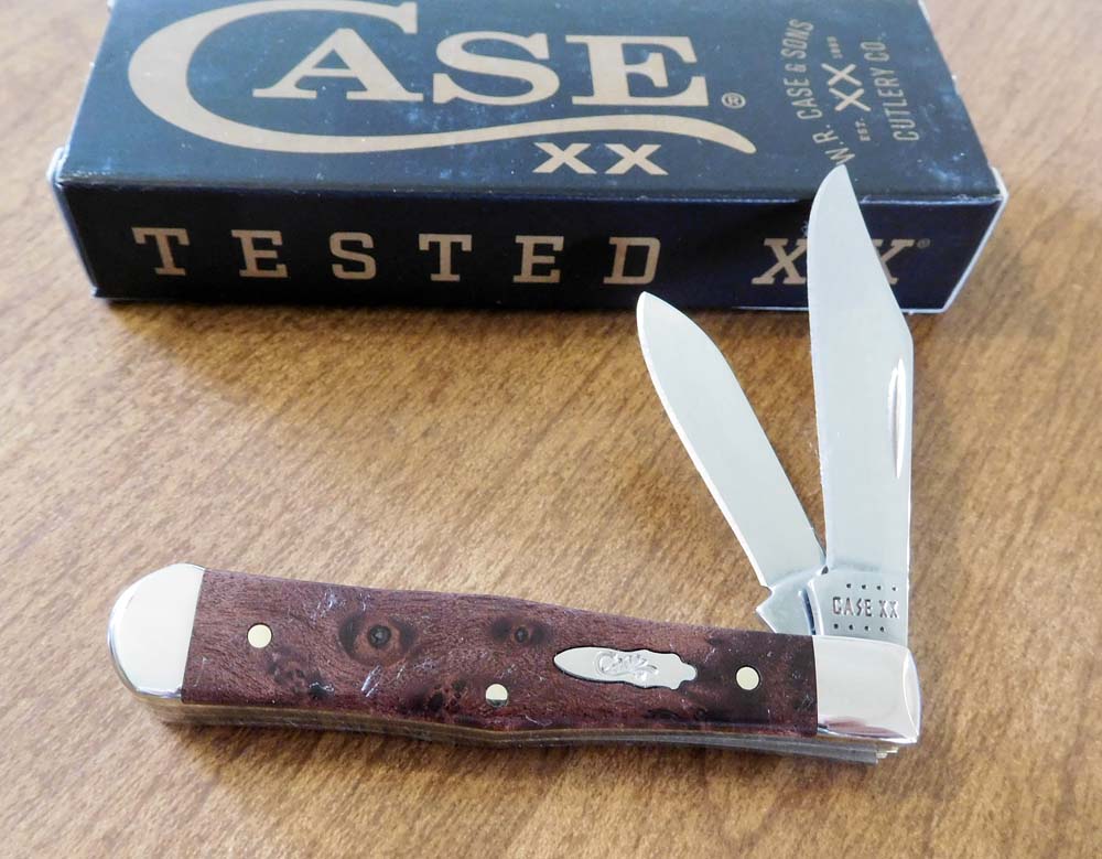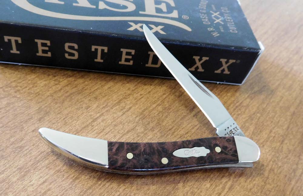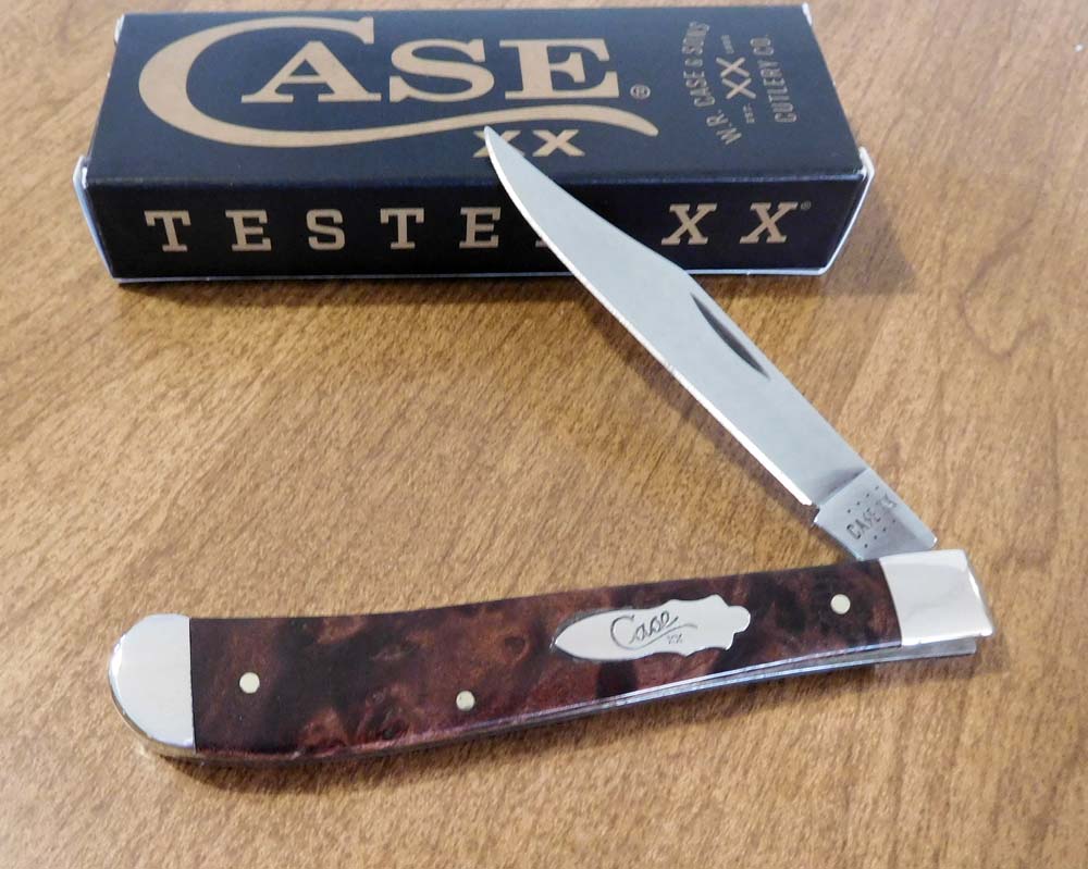 BROWN MAPLE BURL HANDLE 2 BLADE TRAPPER, 7254 SS. 4 1/8" CLOSED.