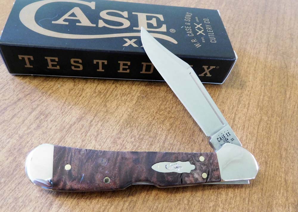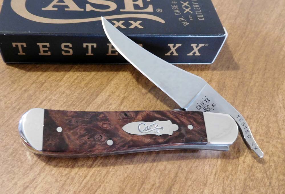 BROWN MAPLE BURL HANDLE SINGLE BLADE MINI COPPERLOCK, 71749L SS. 3 5/8" CLOSED.