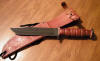 U.S.M.C. FIGHTING/UTILITY KNIFE WITH STACKED LEATHER HANDLE, USMC CV. 12 1/8" OVERALL, 7" CARBON STEEL BLADE. LEATHER SHEATH.