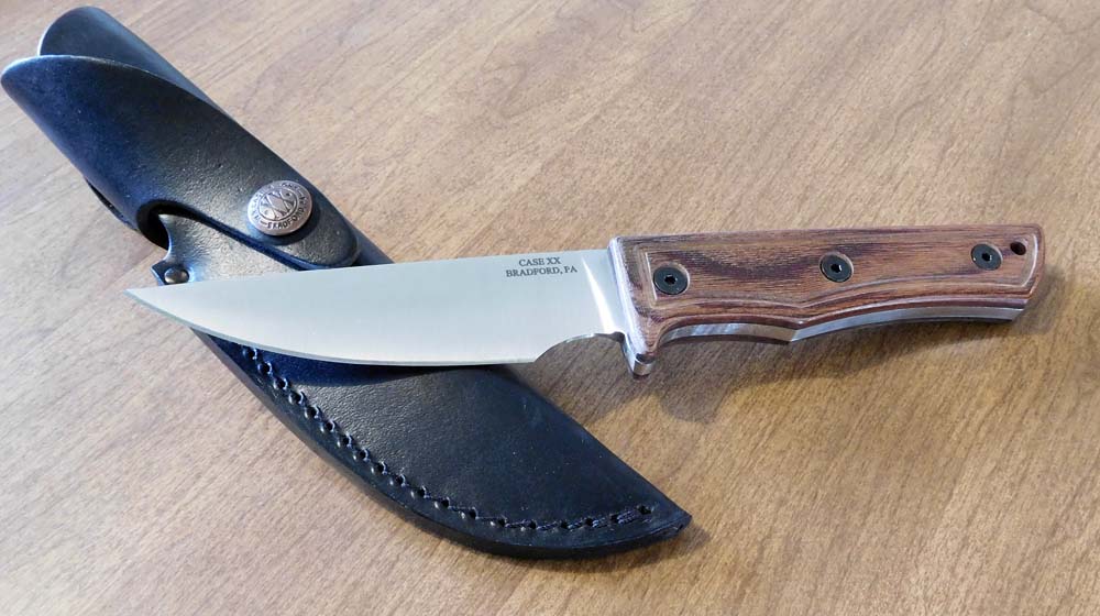 BLACK RUST SMOOTH HARDWOOD COMPOSITE HANDLE HUNTER, FB1012 420 SS. 9 1/4" OVERALL. 4 3/8" 420 STAINLESS STEEL BLADE. BLACK LEATHER SHEATH.