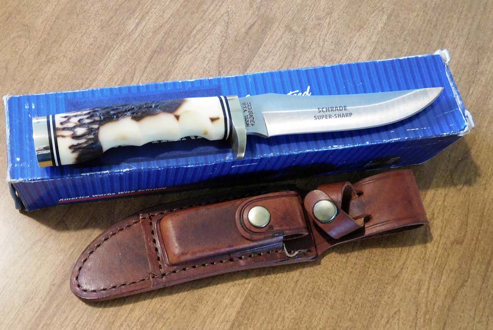 SSK-2721 SCHRADE MAPLE HANDLE NORTH AMERICAN HUNTING CLUB HUNTER. 8 1/8" OVERALL. 3