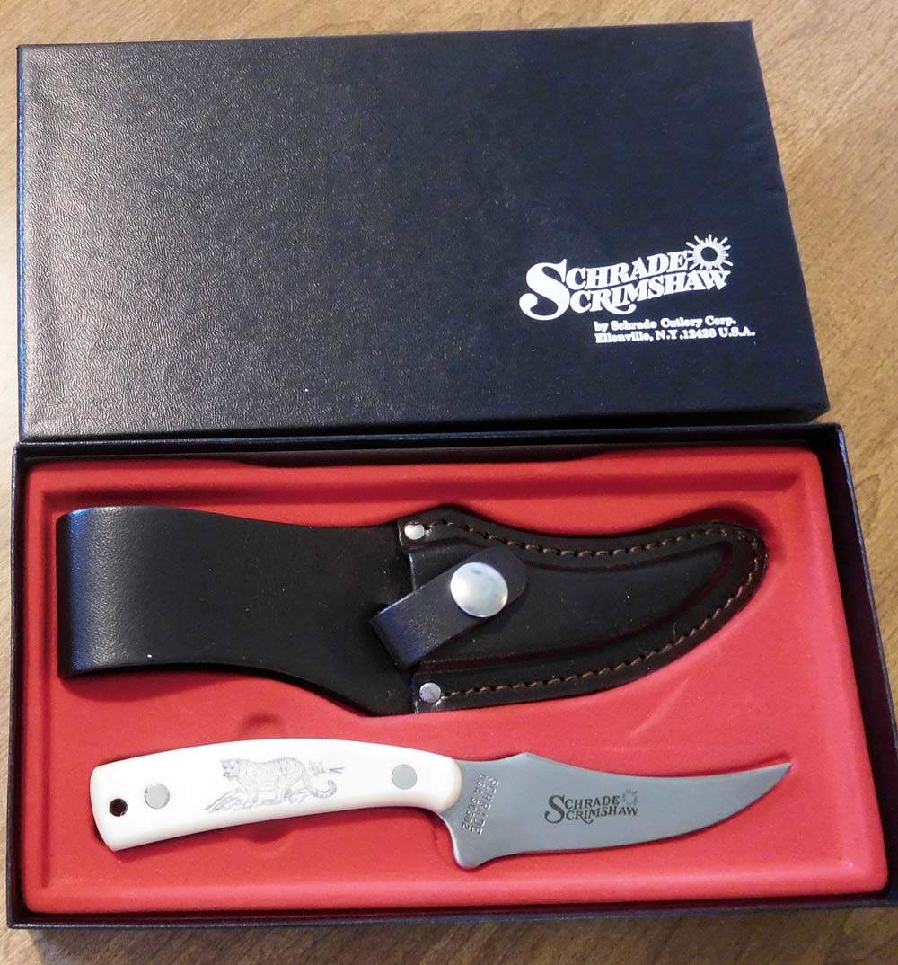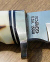 3 3/8" CARBON STEEL BLADE. BLACK LEATHER SHEATH. A MOUNTAIN LION IS SCRIMSHAWED ONTO THE HANDLE. MADE IN USA. MINT CONDITION