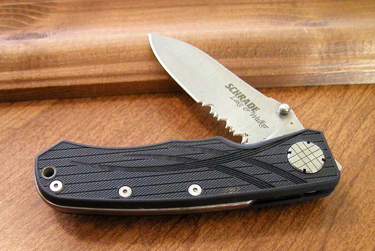 PARTIALLY SERRATED STAINLESS STEEL BLADE. GRAY ZYTEL HANDLES WITH METAL
