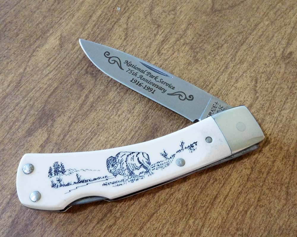 "NATIONAL PARK SERVICE 75TH ANNIVERSARY 1916-1991" IS PRINTED ON THE BLADE. MADE IN USA. MINT CONDITION,