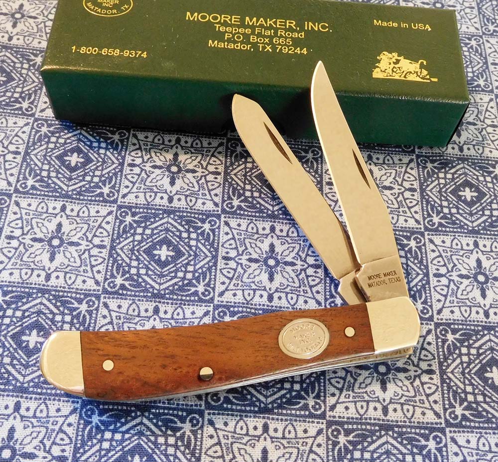 MESQUITE WOOD HANDLE 2 BLADE TRAPPER, 4 1/8" CLOSED. MOORE MAKER SHIELD.