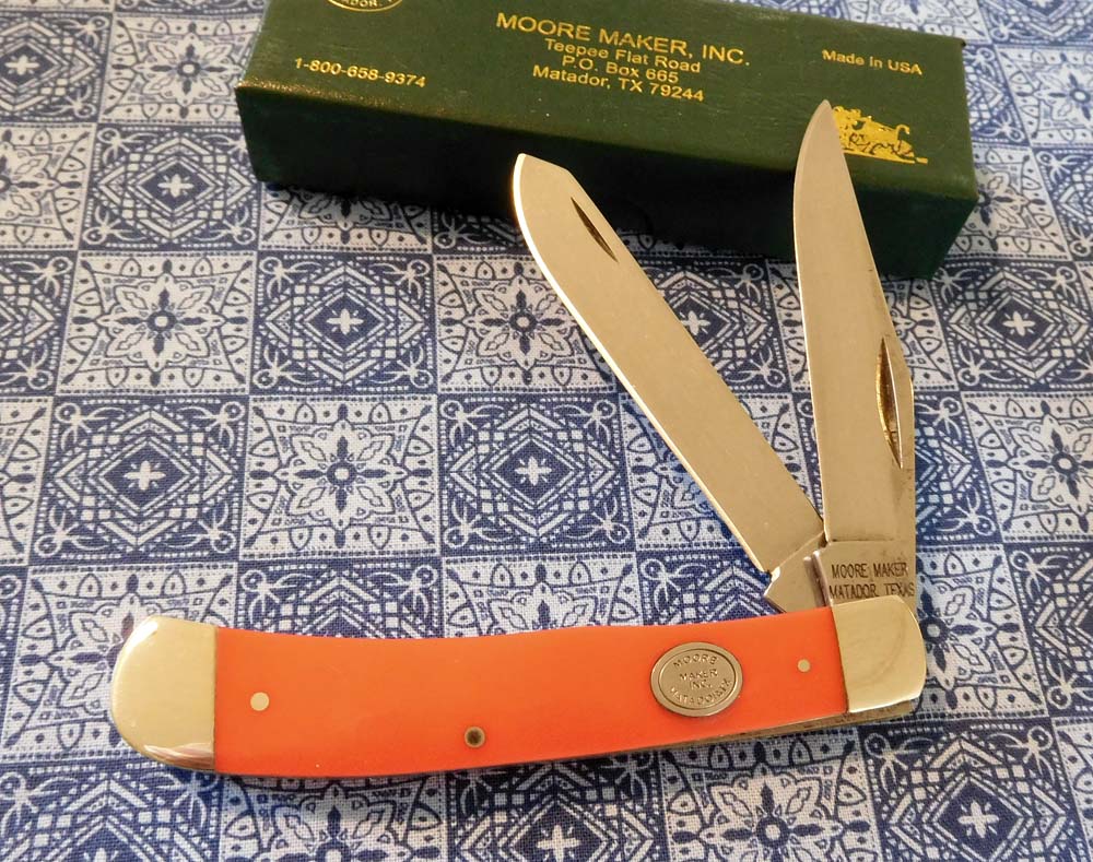 BROWN SYNTHETIC HANDLE SINGLE BLADE SMALL SODBUSTER LOCKBACK. 3 1/2" CLOSED. MOORE