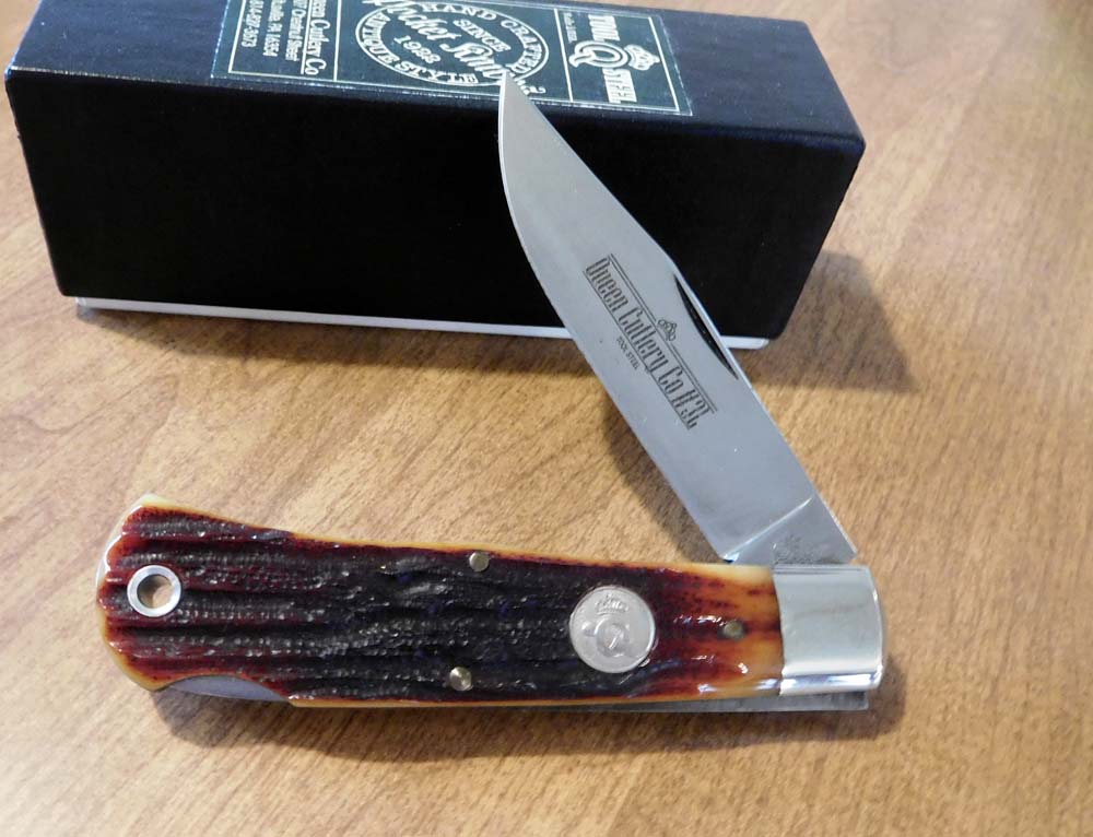 AMBER CARVED STAG BONE SINGLE BLADE LARGE TOOTHPICK, 5" CLOSED. D-2 TOOL STEEL CLIP BLADE.