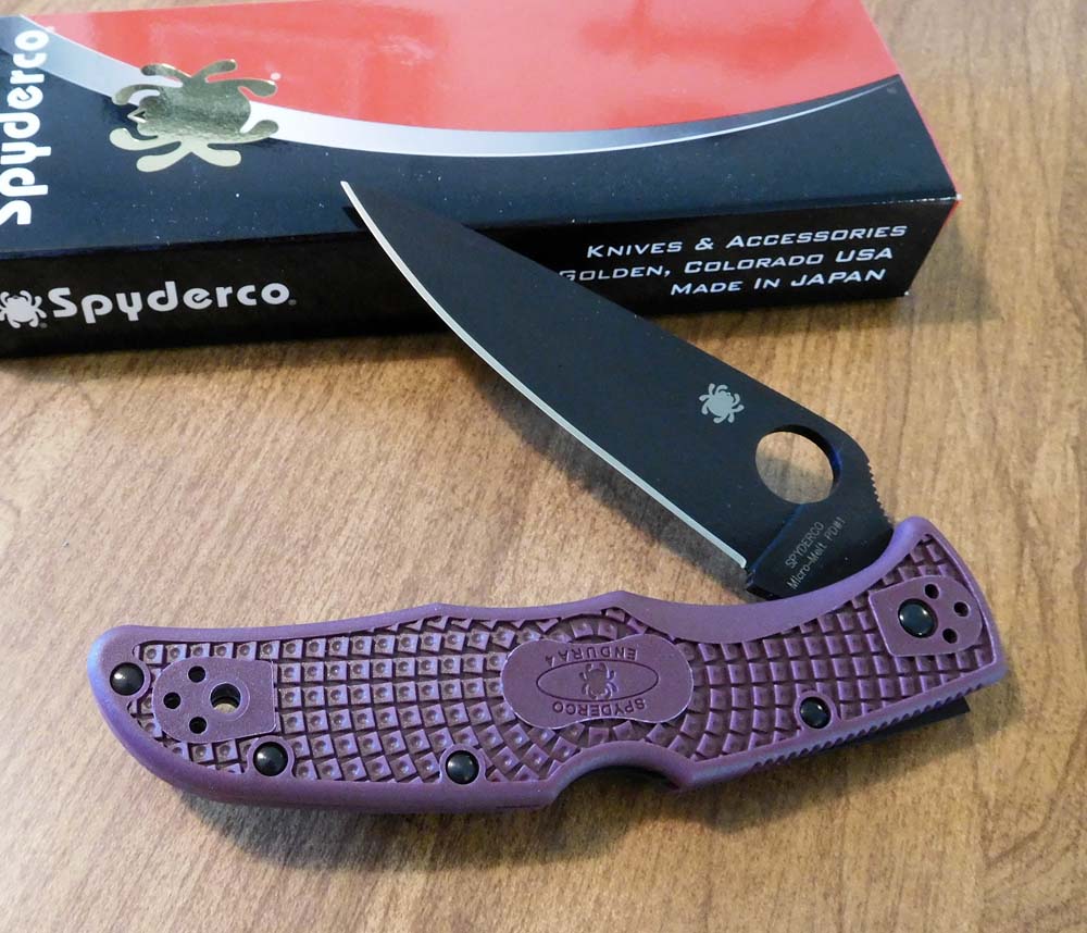 PURPLE ENDURA WITH 3 1/2" VG-10 FLAT GROUND, PLAIN EDGE BLADE. 5" CLOSED.