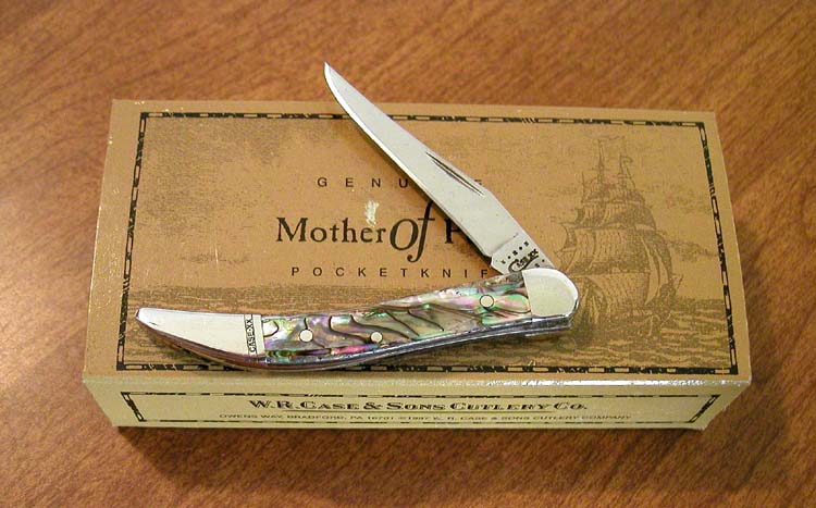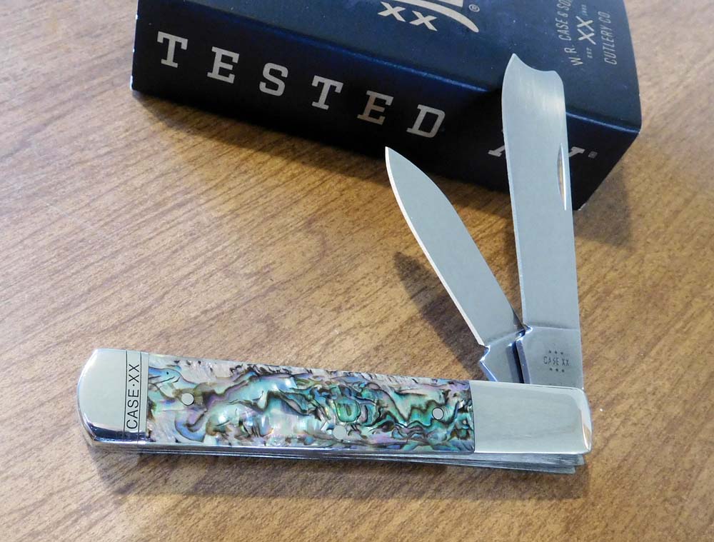 GENUINE ABALONE HANDLE 2 BLADE TRAPPER, 8254 SS. 4 1/8" CLOSED. TRU-SHARP STAINLESS STEEL CLIP AND