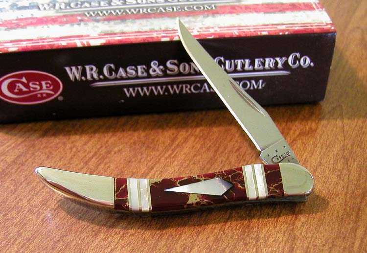 RED/GOLD JASPER HANDLE SINGLE BLADE TINY TOOTHPICK, EX10096SS. 3" CLOSED. MOTHER OF PEARL DIAMOND SHIELD. TRU-SHARP STAINLESS STEEL CLIP BLADE. 1 OF 500.