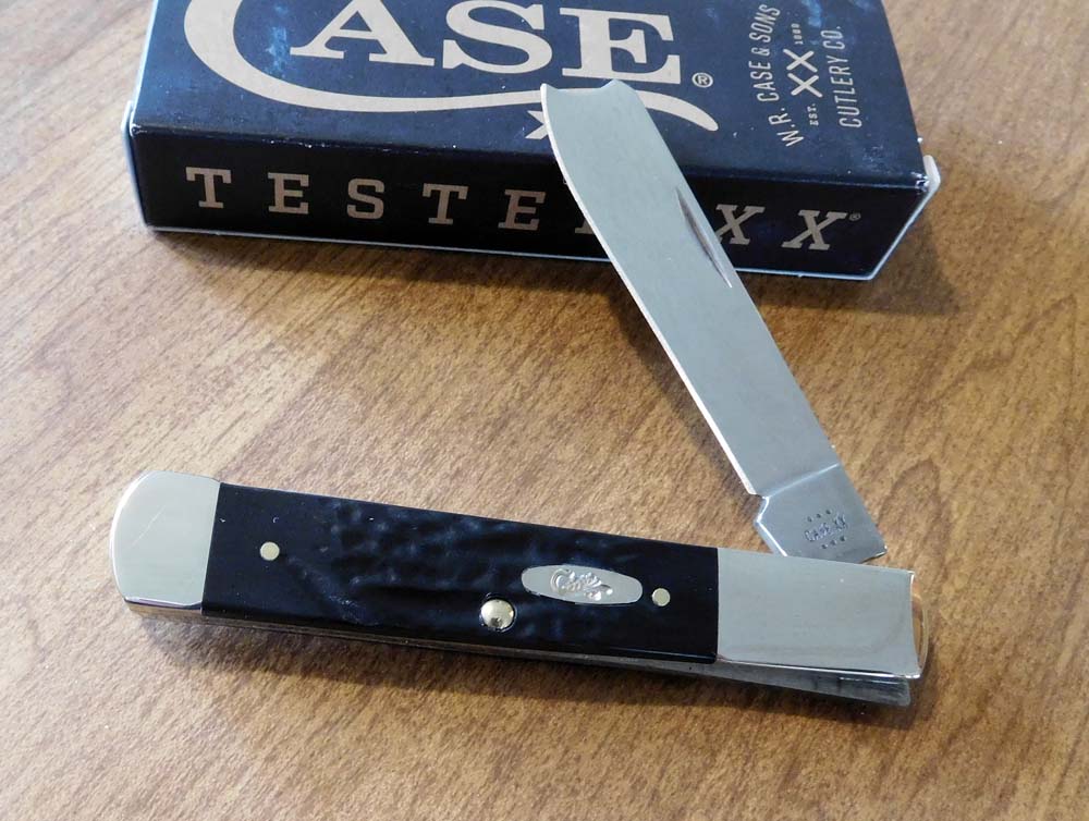 ROUGH BLACK JIGGED SYNTHETIC HANDLE 2 BLADE TRAPPER, 6254 SS. 4 1/8" CLOSED.